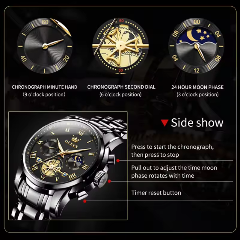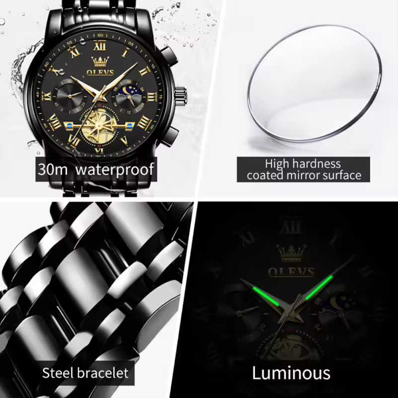 El OLEVS 2859 combina la precisión del movimiento de cuarzo con un diseño elegante tipo negocios/deportivo. Correa en acero inoxidable, caja de aleación y ventana de dial con vidrio recubierto para mayor durabilidad.