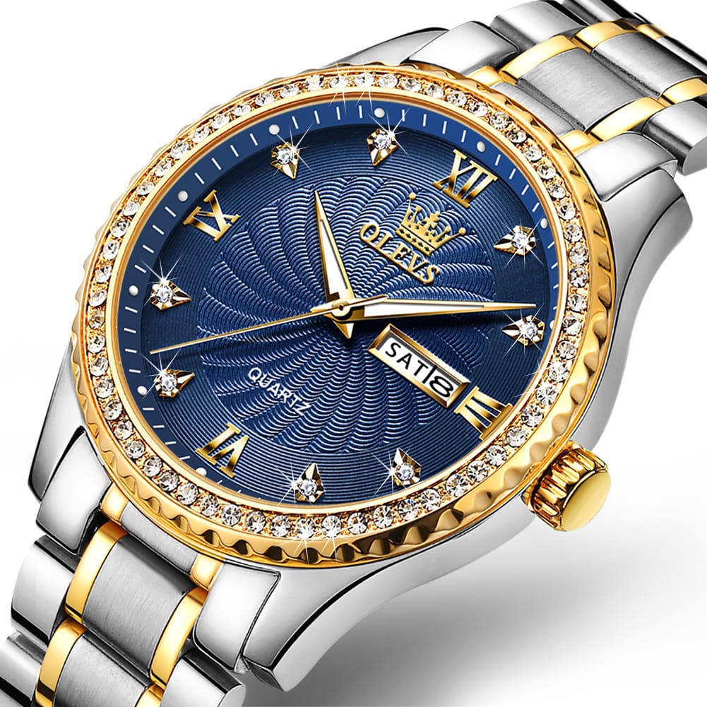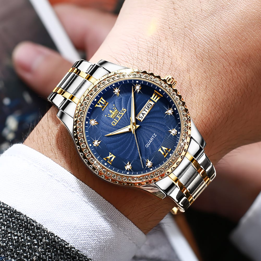 Este modelo combina un azul profundo elegante con detalles dorados y un bisel brillante que resalta inmediatamente en la muñeca. Es de esos relojes que cuando alguien lo ve, inevitablemente pregunta: