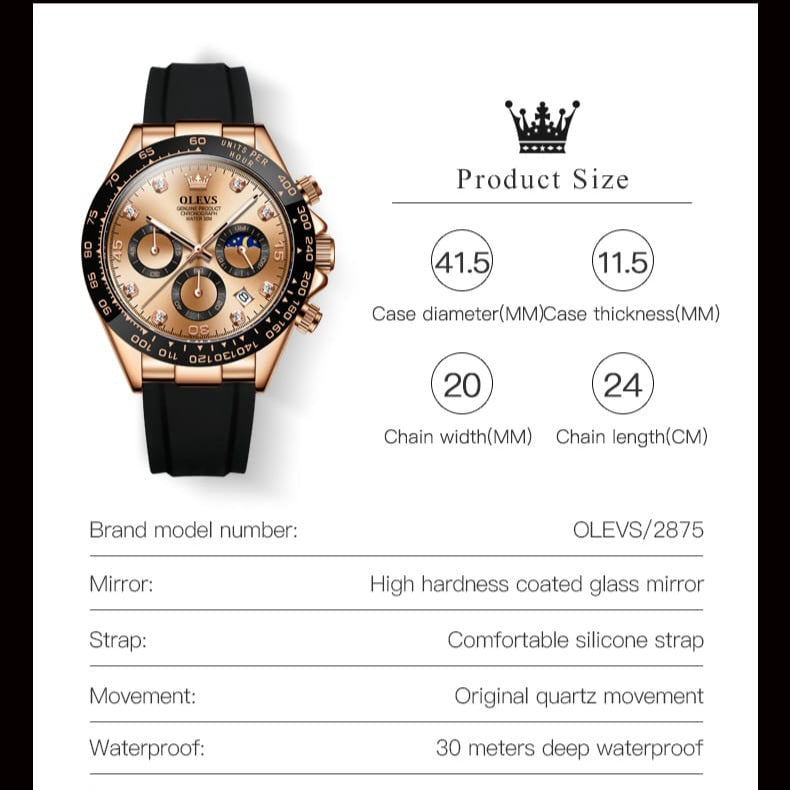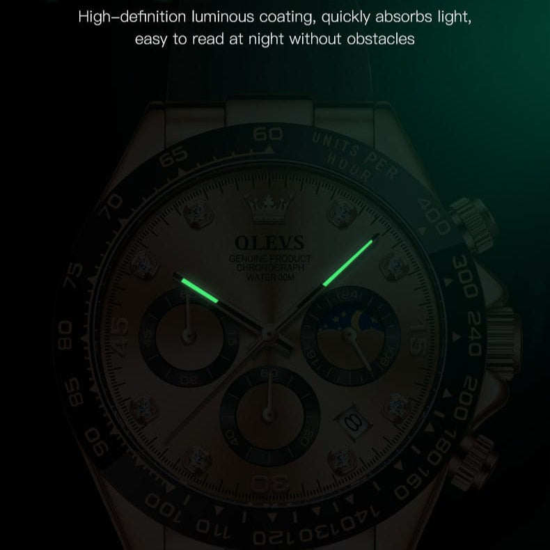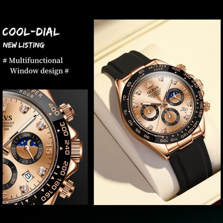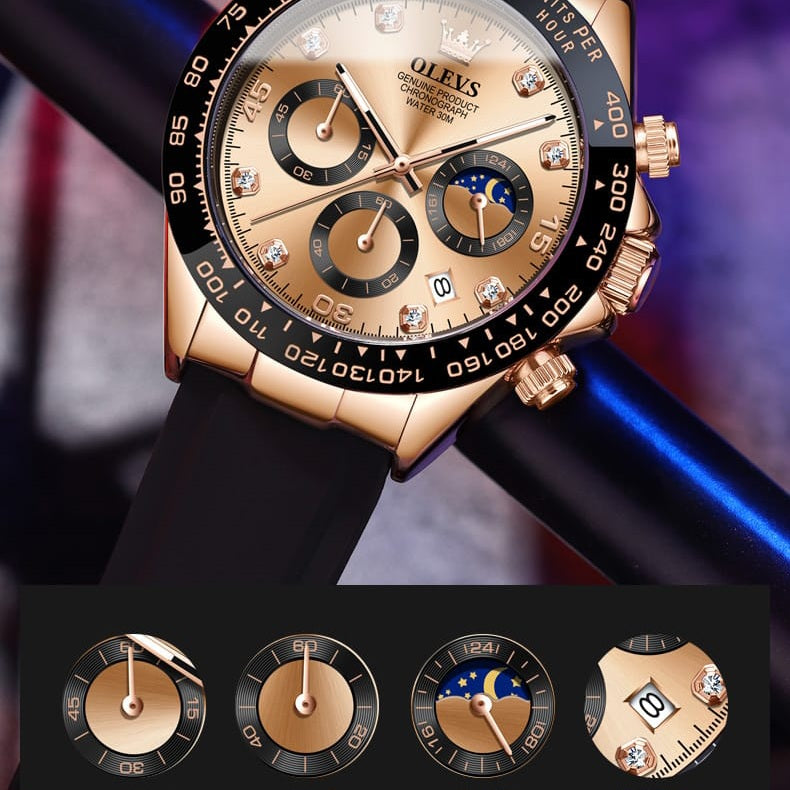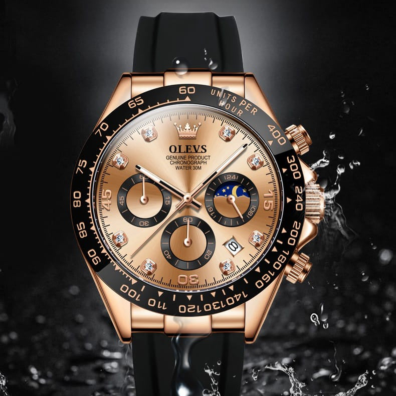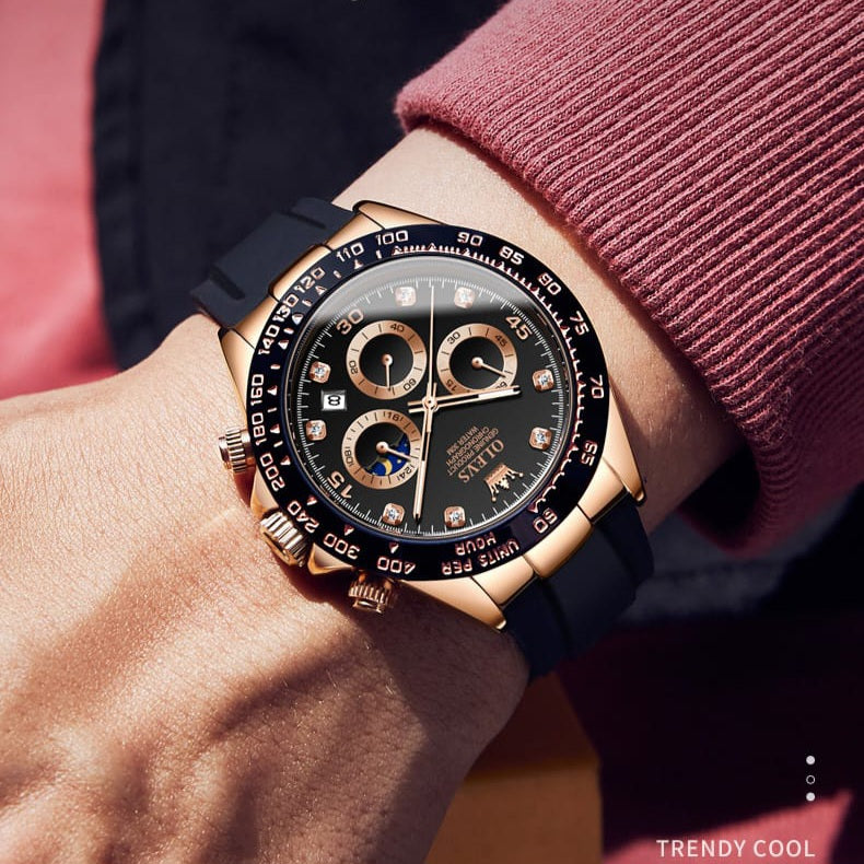 El diseño combina un acabado dorado elegante con un bisel deportivo y correa negra que le da una apariencia fuerte y moderna. Es el tipo de reloj que inmediatamente resalta en la muñeca.