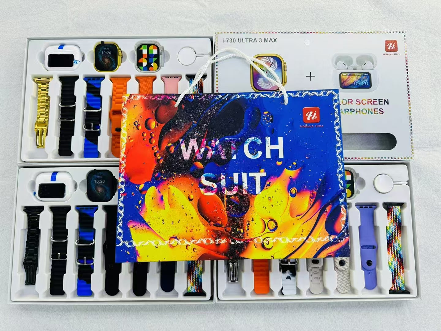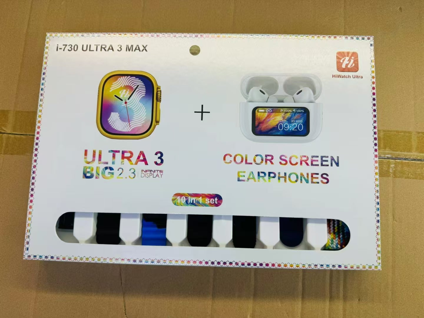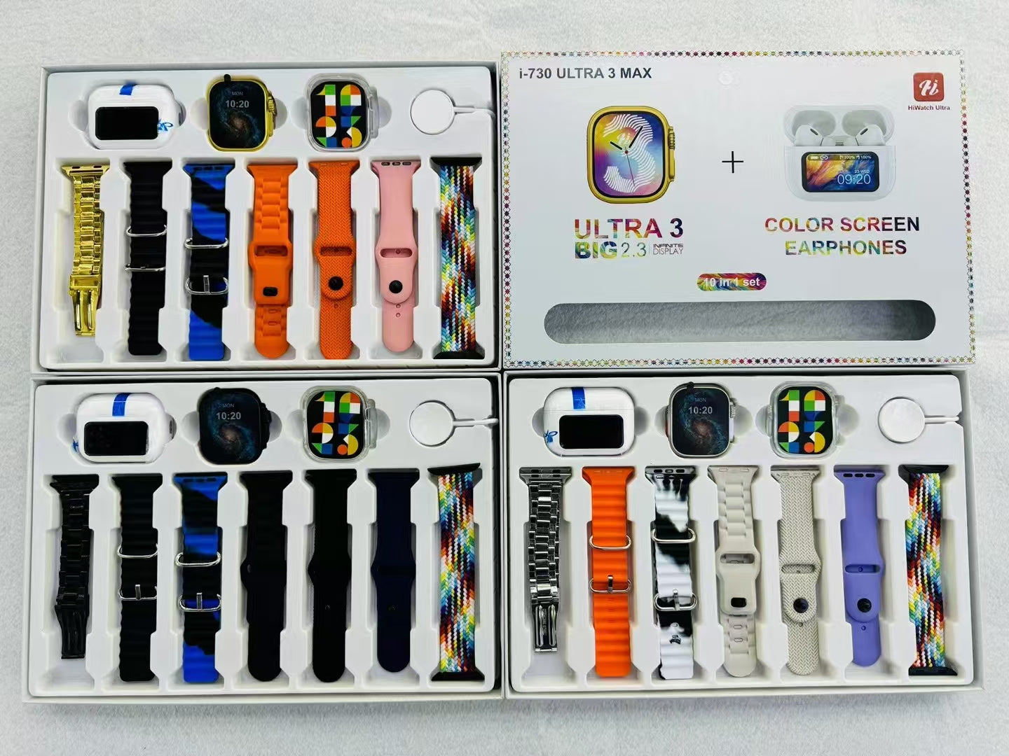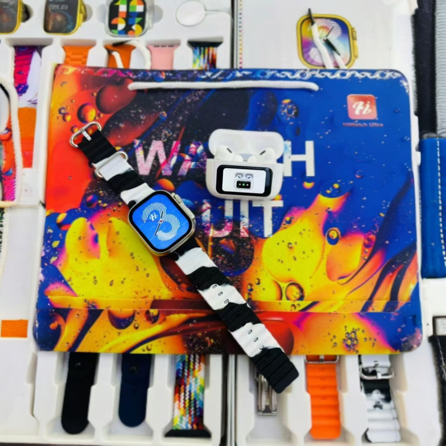 Smartwatch estilo Ultra + estuche de audífonos con pantalla + 7 correas + estuche de reloj y bolso de mano. Todo en un solo paquete premium.